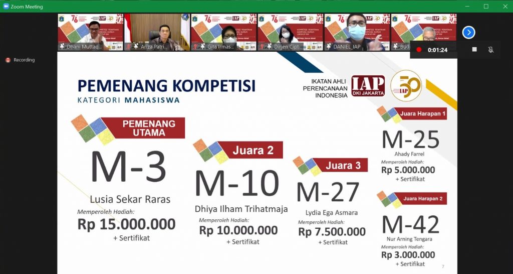 Tim ini mampu mengalahkan perwakilan dr ITB dan UI dan mendptkan hadiah 15 juta. Pada acara puncak, penjurian dilakukan oleh: Bapak Anies Baswedan (Gubernur DKI Jakarta), Bapak Budiarsa (Direktur FIABCI indonesia), Ibu Gita (GM Lippo karawaci), Ibu Diana (Dirjen Cipta Karya PUPR), dan Bapak Dhani (Ketua IAP DKI Jakarta). Pemberian penghargaan secara simbolis dilakukan oleh Bapak Ahmad Riza Patria selaku Wakil Gubernur DKI Jakarta. Beliau berharap ide dan gagasan dari para pemenang dapat segera di implementasikan sebagai masukan bagi Pemerintah Provinsi DKI Jakarta.